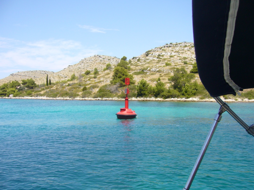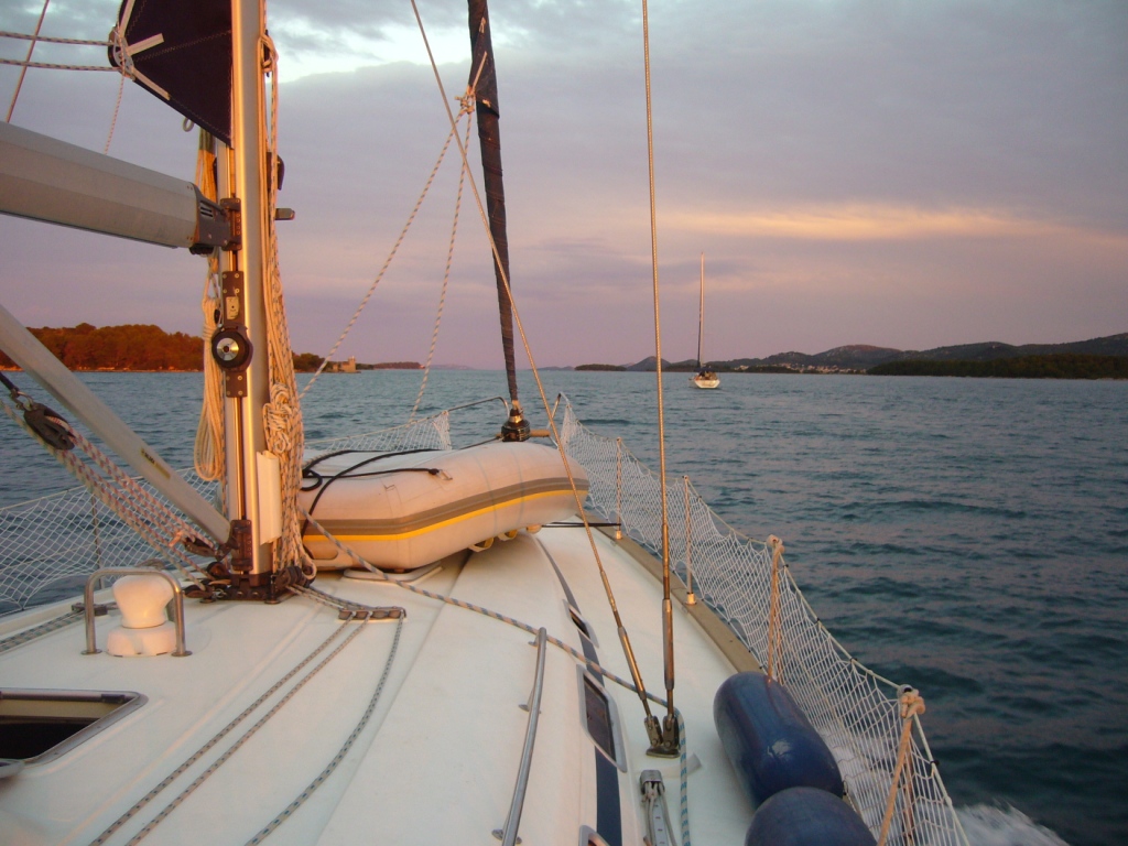 Plan był ambity, załogi pozytywnie nastawione, pogoda doskonała, łódki świetnie się prezentowały i zapewniały wręcz luksusowe warunki dla 10 członków załogi. Wyjście z portu Zadar z jego wewnętrznych basenów nie jest łatwe. Sobota to typowy dzień, kiedy zmieniają się czartery i w marinie jest ruch. Nasze ponad 12 metrowe jachty cumowały w niezłym tłoku, wyjście na przysłowiowe jajeczko w tym wypadku było zgodne z prawdą, niestety nie mieliśmy sterów strumieniowych, więc „sztuczne” wspomaganie nie wchodziło w grę – tylko precyzja sternika i współpraca załogi. Po dwóch manewrach ostro w prawo wyszliśmy na zatokę i szybko weszliśmy na kurs Zatoka Soline. Czemu wyrwaliśmy się z bezpiecznego i obfitującego we wszelkie dobra portu? Dlatego, że wcześniej spędziliśmy dobę jadąc samochodami i wszystko, co kojarzyło się z lądem było nie do wytrzymania. Ponadto znajomi znajomych byli w tym rejonie i właśnie w Zatoce Solinie mieliśmy się spotkać. Początkowo na żaglach (pierwsza wprawka) następnie na silniku przez 5h zrobiliśmy 25Mm i o północy dotarliśmy na miejsce. Ale zanim to mieliśmy małą przygodę z sieciami rybackimi. Na wysokości otoku Kasara zbliżyliśmy się do słabo oznaczonych (nocą prawie niewidocznych) bojek sieciowych, tylko czujność sternika i szybki zwrot uchronił nas przed zdejmowaniem sieci z kila. Na miejscu, świetle latarek odszukaliśmy boje cumownicze i jak wiele łódek obok majestatycznie „wisieliśmy” na bojce. Lekka kolacja, śpiew i spanie, bo dzień żeglarsko nie był długi, ale jeszcze mocno czuliśmy w ciele niewygody podróży.