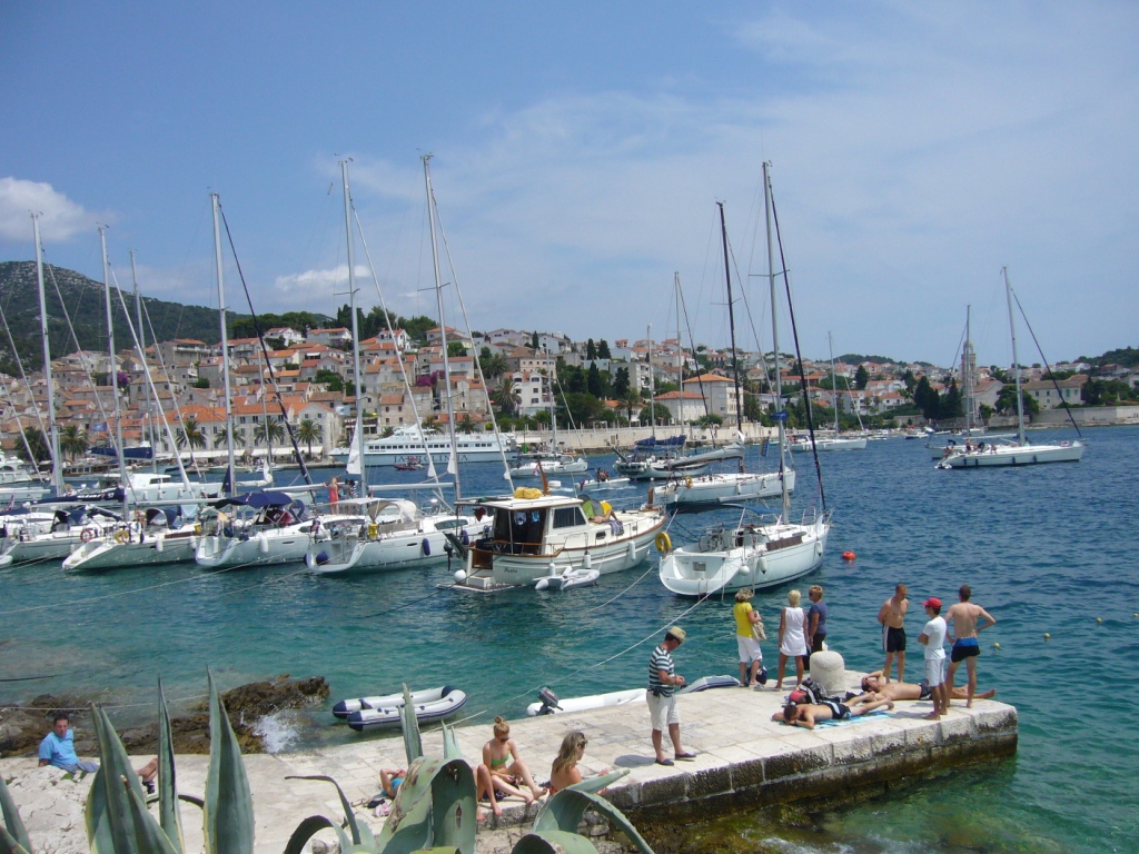 Pogoda nocą się zmieniła. Spadł deszcz i zalał nam mesę – zwyczajowo luk w suficie był otwarty. Deszcz o tej porze roku to ewenement, ale lato 2011 było dziwne. Zmiana frontu pociągnęła za sobą zwiększenie siły wiatru i zachmurzenia. Wyjście z zatoki było jeszcze spokojne, postawiliśmy grota i foka, po czym dostaliśmy mocne uderzenie wiatru. Zrefowaliśmy dwukrotnie foka i raz grota, łapiąc odpowiedni trym żagli i przy 6B w porywach do 7B skierowaliśmy dziób na Hvar. Rozkołys morza był spory, Bavaria „szuflady wali raz po raz” a załoga blada… Nie trwało to długo, bo schowaliśmy się za wyspy, w zatoce okalającej stare i piękne miasto Hvar. To był główny punkt dnia, zwiedzanie i obiad w Hvarze. Jako że miejsce jest urokliwe to i gwarne (ludne) wiele jachtów, wszystkie na kotwicach (w porcie jest płytko i stoją tylko jednostki o małym zanurzeniu) okupuje zatokę. Wyjście do miasta spragnionej kilkudniowym rejsem załogi wzbudza duże emocje, panie się malują, dzieci skaczą a panowie dbają o logistykę. Kiedy wszyscy są na lądzie podziwiamy stare mury, piękny rynek i fortecę. Słońce leje się z nieba (Hvar to najbardziej nasłonecznione miejsce w Chorwacji) a Ożujsko leje się do gardła. Nasyceni udajemy się do łódek aby dotrzeć do zatoczki mini portu Stiniva. Sprawne postawienie żagli, umiarkowany, ale żwawy wiatr pozwalają nam szybko osiągnąć miejsce docelowe. Jest jeszcze wcześnie wiec postanawiamy poćwiczyć halsowanie. Na morskiej łódce wygląda to nieco inaczej niż na mazurskiej łajbie. Kilka podpowiedzi sternika i już szotmeni sprawnie przerzucają foka z burty na burtę. Niestety planowane cumowanie w zatoce Stiniva nie udaje się, brak miejsc dla dwóch łódek. Szybka zmiana planów i trafiamy do cichej, pustej i pięknej zatoczki L Tiha. Rzucamy kotwicę z dziobu, rufę cumujemy do brzegu. Pada komenda „tak stoimy” i wszyscy mamy czas wolny.