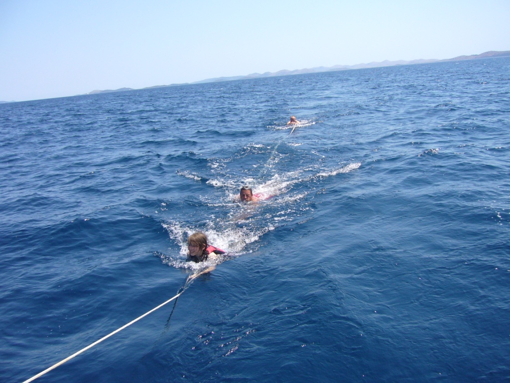 Po zwiedzaniu, wielu ochach i achach ruszyliśmy dalej szczególnie, że w najbliższym rejonie Modrej Spilji nie można zacumować. Bojek tam nie ma a i kotwicy nie rzucisz bo za głęboko… Postawiliśmy wszystkie żagle i ruszyliśmy zwiedzać zatokę Komizę, gdzie uprawialiśmy free diving i podziwialiśmy wielkie ślimaki przypominające kształtem i kolorem coś zupełnie innego. Potem pożeglowaliśmy w kierunku bunkrów Rogacic miejsca gdzie marszałek Tito zbudował schrony dla szybkich kutrów torpedowych patrolujących wybrzeże Jugosławii. To była atrakcja dla dużych i małych chłopców, miejsce ciekawe, jako kunszt ludzkiej sztuki inżynieryjnej, ale wszędzie mnóstwo śmieci i brudu. Po ekskursji obraliśmy kierunek – wyspa Vis i piękny stary port z broniącą go twierdzą. Zrobiliśmy desant, który udał się po świeże warzywa i pieczywo, po czym ruszyliśmy w kierunku Diabelskich Wysp. Tam mieliśmy się spotkać z drugą łódką i planowaliśmy wyjściową kolację w tawernie U Tereski. Dnia było jeszcze sporo, więc zaliczyliśmy udaną kąpiółkę w jednej z licznych zatoczek. Około 16:00 zjawiliśmy się wśród Diabelskich Wysp nie znajdując znajomych. Łódek tam było sporo, więc wycofaliśmy się i postanowiliśmy urządzić zawody na odbijaczach. W asyście pontonu nasze łódkowe dzieciaki wskakiwały do wody w kamizelkach i łapały się długiej cumy zakończonej dużym „obibokiem”. Zawody polegały na tym, kto dłużej się utrzyma, kiedy sternik wciśnie przysłowiowy gaz do dechy Opór wody jest tak duży że już niewielkie przyspieszenie jachtu powoduje zalewanie oczu i buzi pływaka co w konsekwencji rodzi odpadnięcie od liny i przegraną. Po zabawie odszukaliśmy znajomych w zatoczce i zacumowaliśmy blisko brzegu stając na kotwicy. Zmrok zapadał włączyliśmy światło kotwiczne na maszcie i udaliśmy się na małą kolacyjkę do przyjaciół robiąc z tzw. pomost, dzięki któremu można przechodzić bezpiecznie z łódki na łódkę.