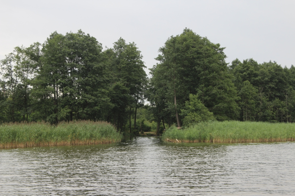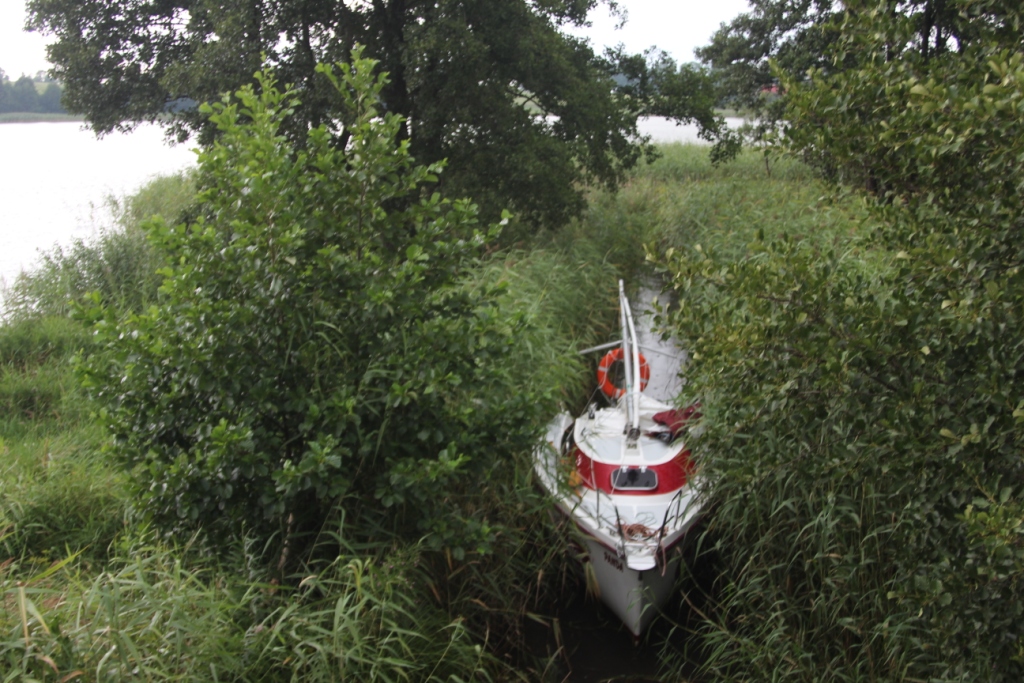 Było to 17 lipca 2014. Tego dnia upał stał się niemiłosierny i zbierało się na burzę. Wypłynęliśmy z Pięknej Góry trochę po 14.00, a więc pozostało nam niewiele czasu na dopłynięcie do Dejgun (zakładaliśmy, że tego dnia się tam znajdziemy). Wiało słabo, więc na silniku dopłynęliśmy na koniec Tajt. Chłopaki patrzyli na mnie z przekąsem, gdy pokazywałem na wielką kępę trzcin mówiąc, iż musimy w nią wpłynąć, aby dostać się na rzekę prowadzącą do celu. Ja jednak rozpędziłem łódź i z impetem wjechałem w trzciny. Po chwili musieliśmy wyjść z żaglówki (byliśmy na to przygotowani – wodne buty, itp.), aby przepchnąć ją dalej. Na początku szło nam nieźle. Jednak po 20 metrach Ziutek, który był z przodu łodzi, krzyknął, że dalej nie da rady bo wody jest po kostki. Poszliśmy z Czarnym do niego. Faktycznie. Pod mostem kolejowym wody było z 5 cm. Konsternacja. Co robić? Czy przekopujemy rzeczkę? Bez sensu, tym bardziej, że podobny poziom może być w dalszej części szlaku. Może zbudujemy tamę i tym sposobem podniesiemy poziom wody? Również bez sensu i to z tego samego powodu. Weszliśmy na most. Przespacerowaliśmy się trochę, aby zobaczyć co nas ewentualnie czeka dalej. Trochę podłamani zastanawialiśmy się jak poprowadzić dalej rejs…