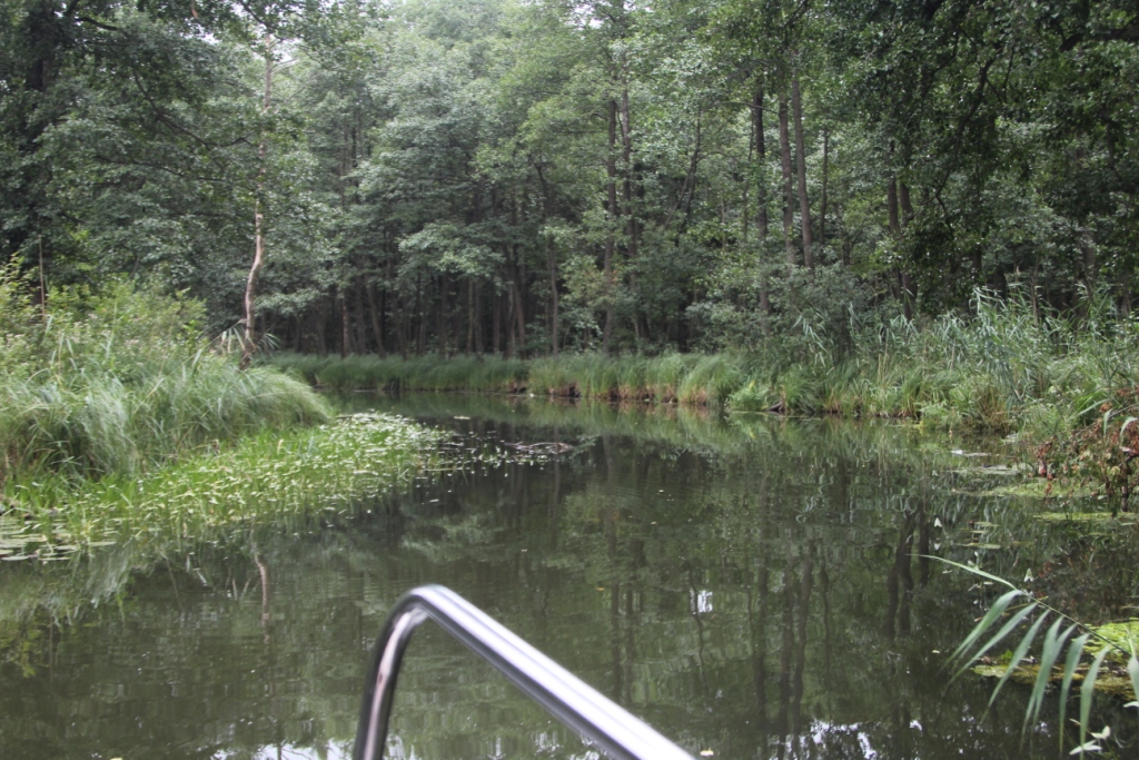 Rano wypłynęliśmy w stronę Ogonek. Tam po krótkiej przerwie na zakupy przeprawiliśmy się na Stręgiel. Wszystko szło zgodnie z planem. Odnaleźliśmy Sapinę i wpłynęliśmy w nią. Tutaj też był niższy stan wody niż zazwyczaj (wiadomo – Czarna Łapa) – widać to było po odsłoniętych korzeniach drzew. Bierzemy poprawkę na stan wody i aby nie szorować o dno lekko podnieśliśmy płetwę sterową i miecz. Po dopłynięciu do pierwszego mostu (w zasadzie drewnianej kładki), już wiemy że Czarna Łapa nie zapomniała o nas. Prześwit pod mostem jest na tyle mały, że aby przepłynąć musieliśmy zdjąć maszt z cęgów oraz odkręcić tylny kosz. Po dwóch godzinach, szczęśliwi że przechytrzyliśmy Czarną Łapę, popłynęliśmy dalej.